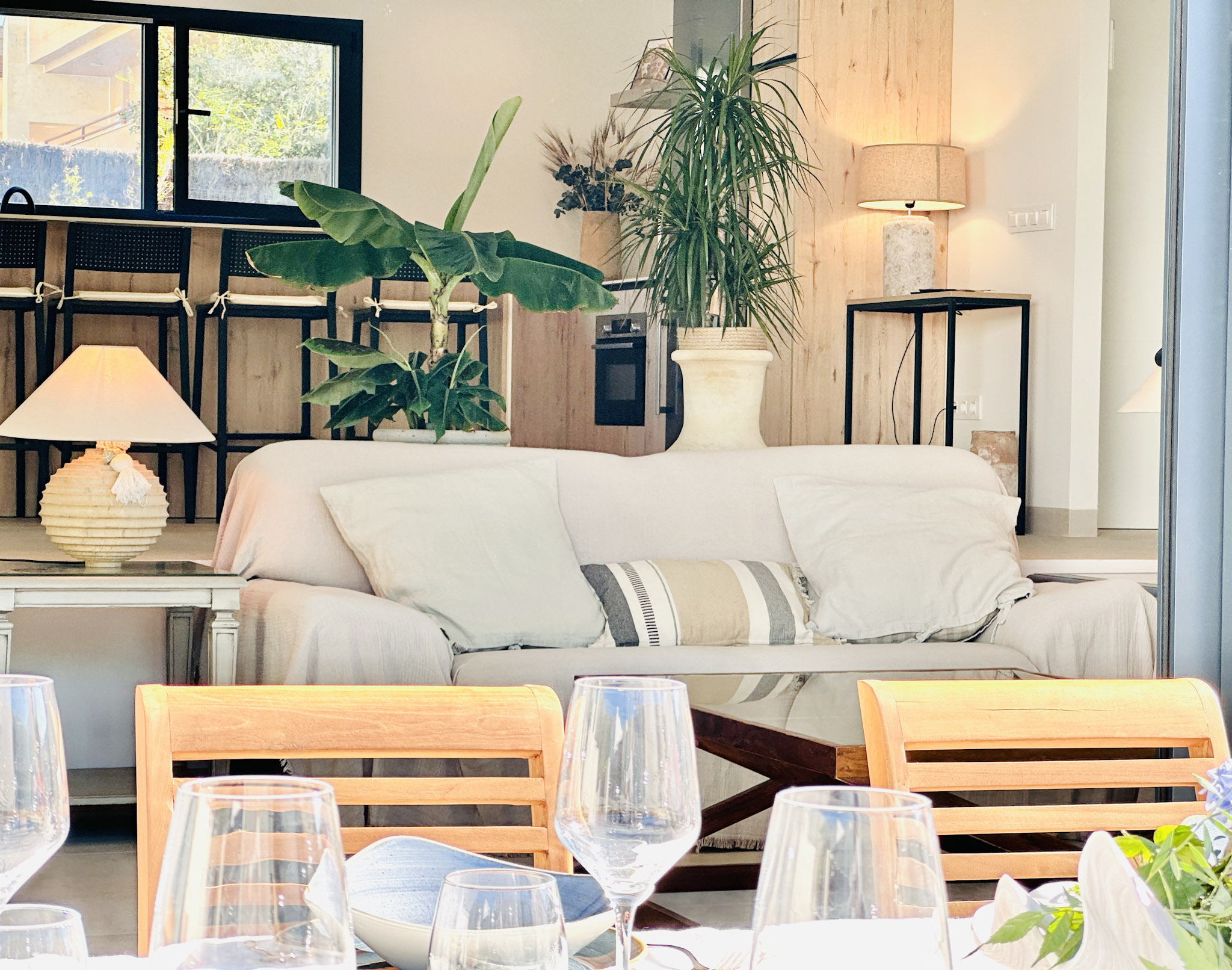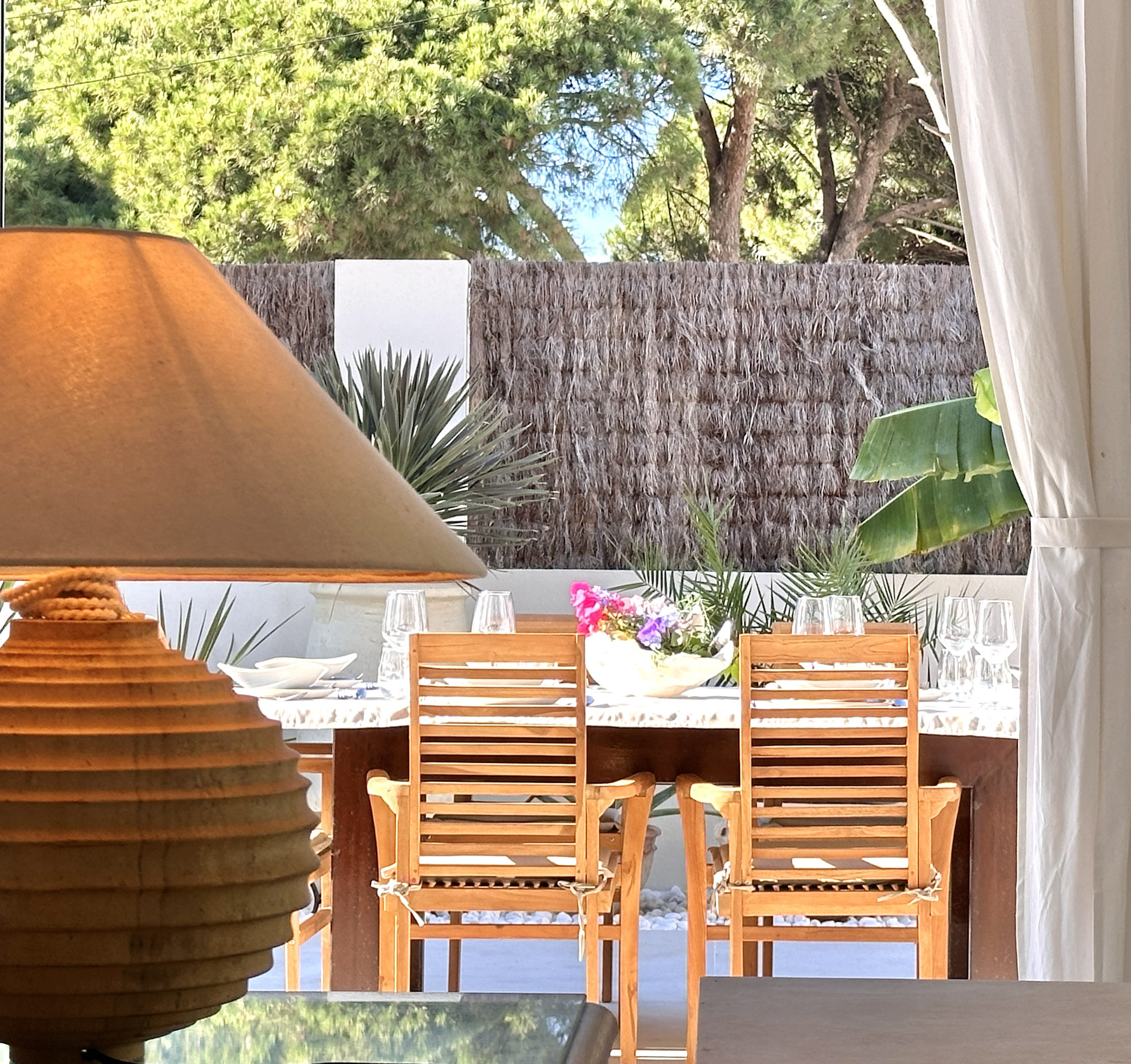 Sus exteriores y jardines están diseñados para la vida al aire libre en cualquier época del año: una gran mesa de comedor en mármol travertino junta a la amplia zona de estar bajo el gran porche acristalado de la fachada principal, zona de césped para relajarse, zona de cocina exterior, y una maravillosa ducha a cielo abierto con agua caliente, completan la experiencia.