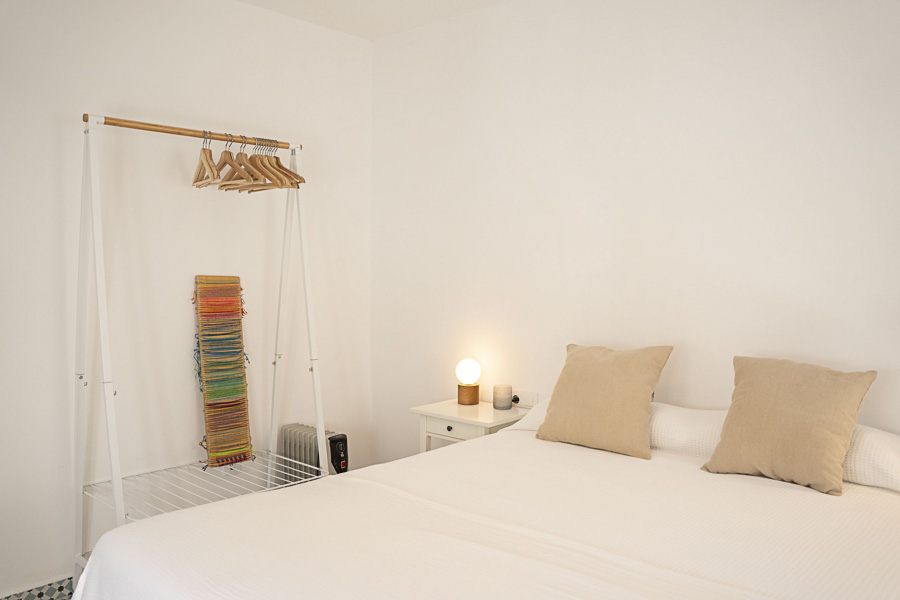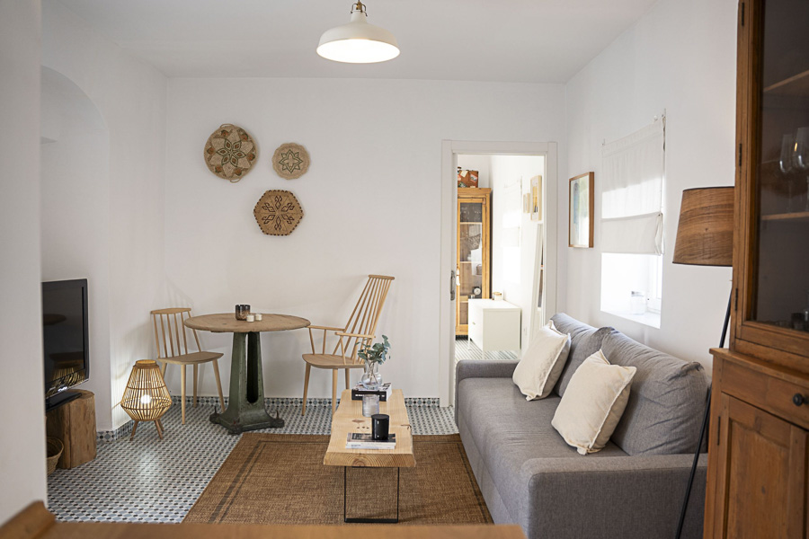 La primera planta del apartamento se encuentra en un bonito patio de vecinos, típico de muchas casas del pueblo y tiene todas sus estancias en la misma planta. La puerta de entrada se abre directamente a un espacio diáfano y luminoso con un salón / comedor y cocina compacta. Del mismo modo hay un espacioso dormitorio con un moderno cuarto de baño con ducha. La casa tiene capacidad para un total de 3 personas, ya que además del dormitorio de matrimonio, el salón consta de un sofá cama, por lo que es ideal para una pareja con un hijo.