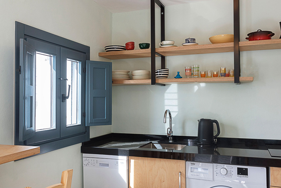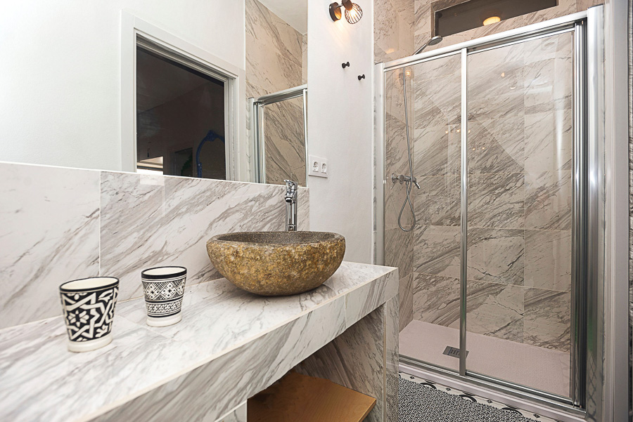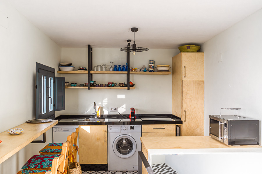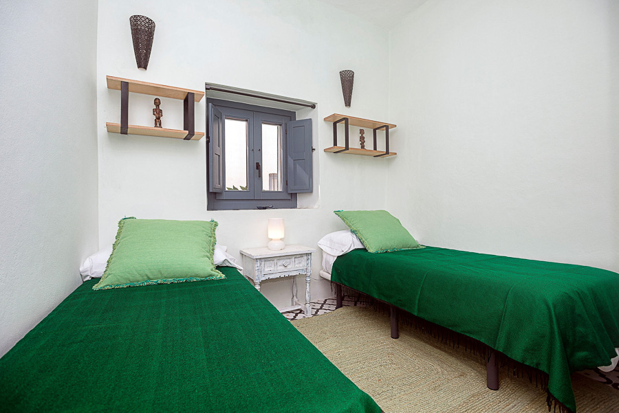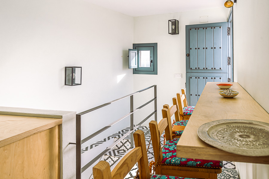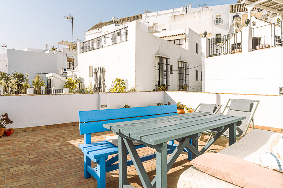 La planta baja tiene el salón, cuarto de baño con ducha y 2 lavabos de piedra y dos dormitorios, uno con cama de matrimonio y el otro con 2 camas individuales. Subimos un tramo de escaleras para llegar a la cocina con barra americana y acceso directo a la terraza con vistas panorámicas sobre Vejer y su campo. La terraza tiene una mesa con dos bancos y cojines, perfecto para disfrutar de momentos de paz y relax.