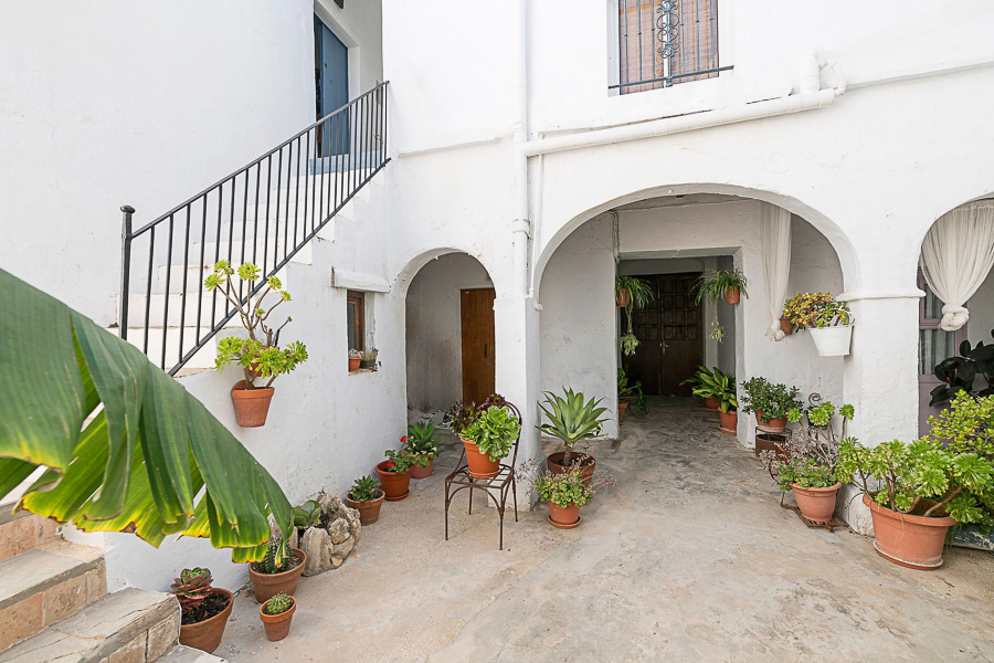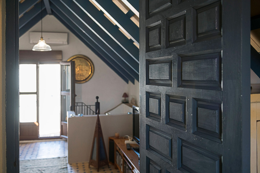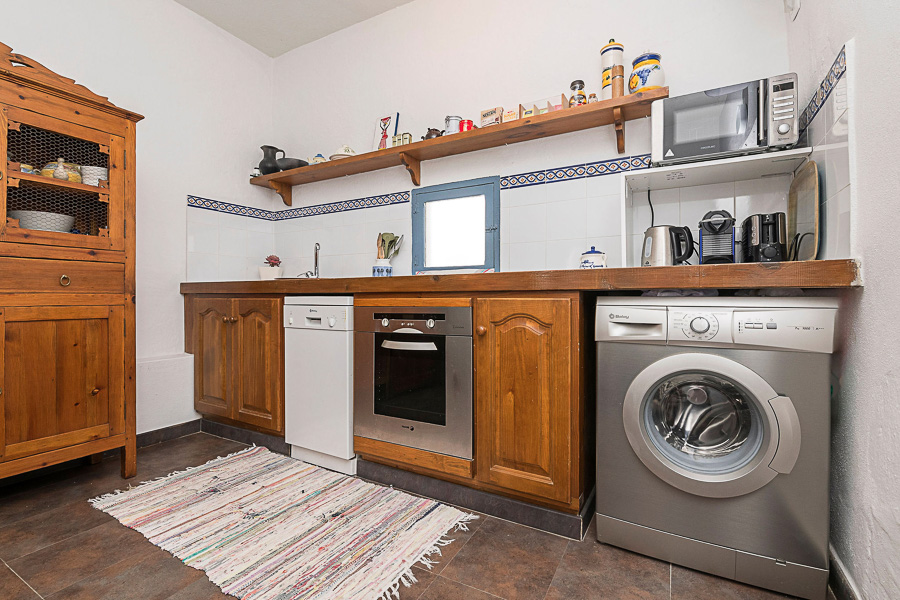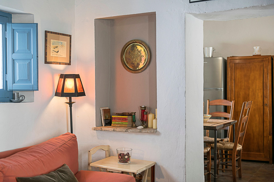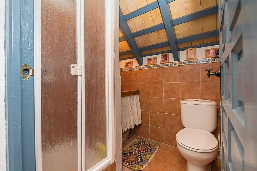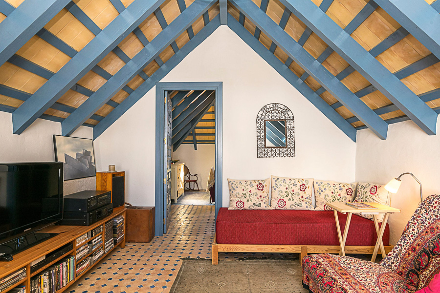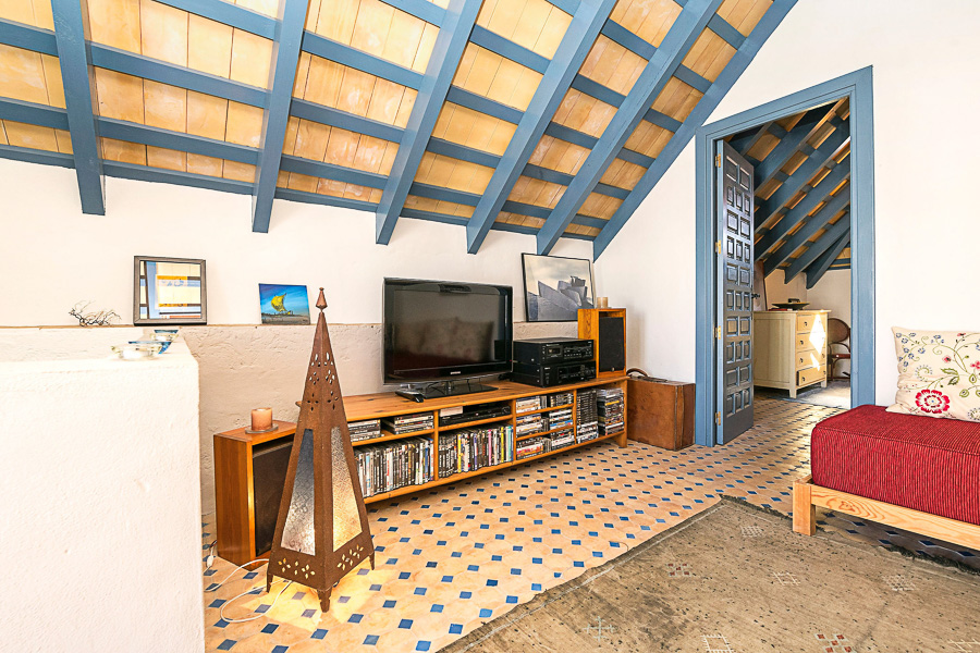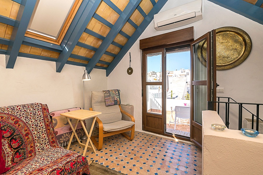 Spiral stairs leads to the first floor which comprises an airy doble bedroom under a pitched roof with striking wooden beams, a bathroom and a living room. This floor opens onto the roof terrace with panoramic views to the town.